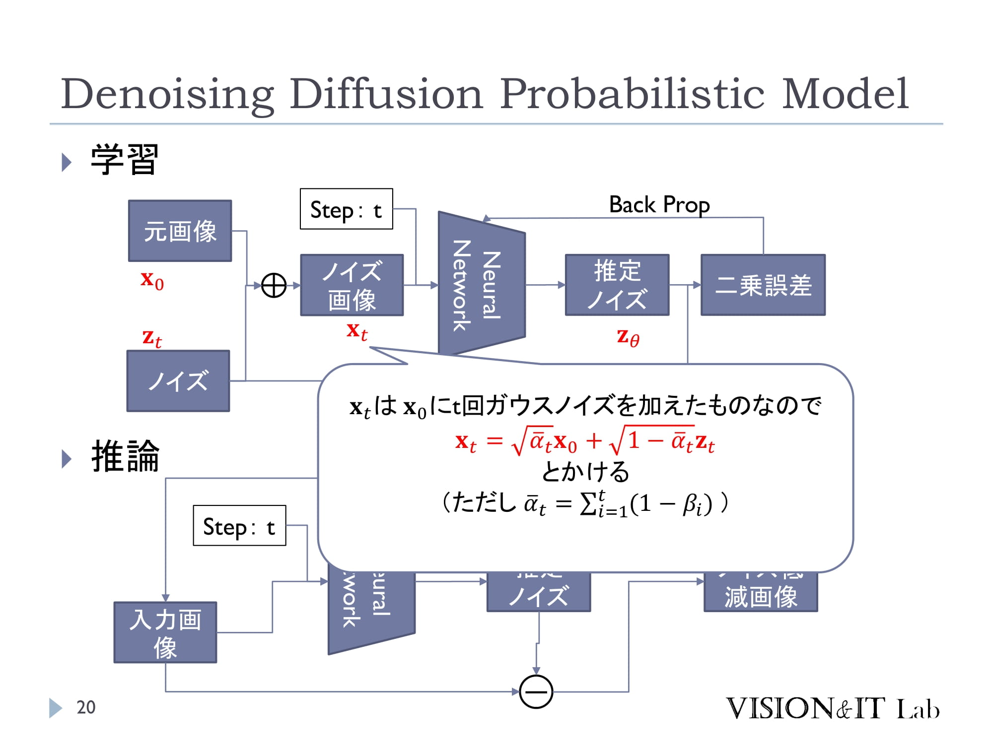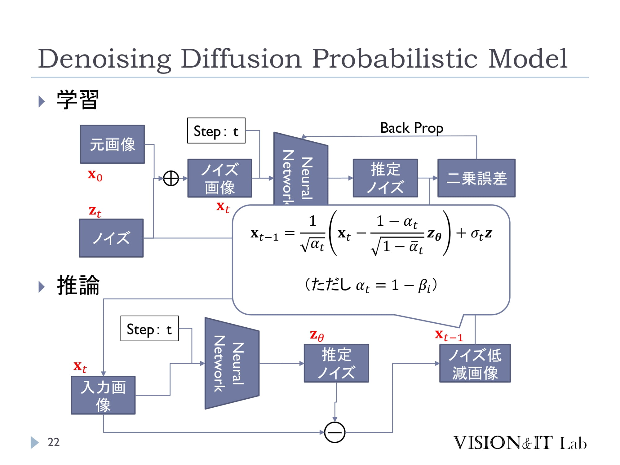 ここで $\mathbf{z}_t$ はステップ $t$ で加えたノイズ、$\mathbf{z}_\theta$ は学習器によって推定されたノイズを表す。